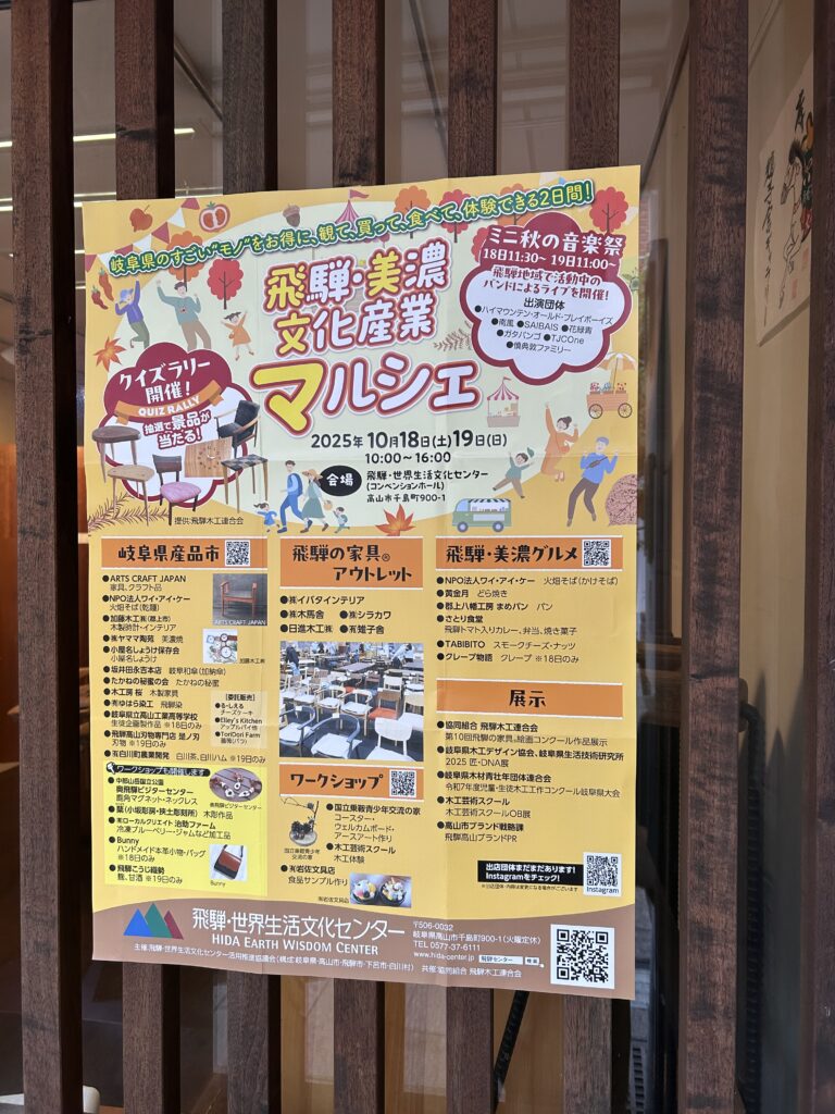 昨年はフェスティバル後に開催されていた、飛騨・美濃文化産業マルシェが飛騨・世界生活文化センターにて10月に開催されます。