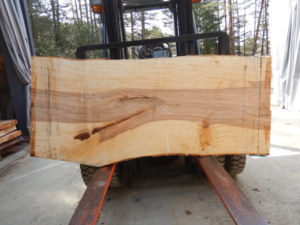 【品番】2402-c570 【樹種】トチ 【寸法】厚み50㎜×巾710㎜~750㎜×長さ1750㎜ ※商品写真は入荷時のものの場合があります。 ※タイミングによっては品切れの場合がございます。あらかじめご了承ください。