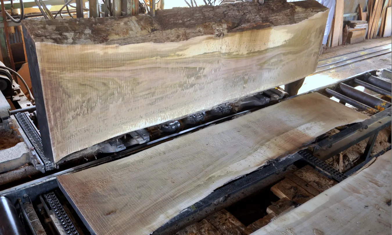 ”木の表情”は製材によって決まります。原木の形や節の位置、中を想像しながらどんな木目が出るかを想定し、ノコを入れる向きを慎重に検討しながら木を開いていきます。木の内側にある自然に育まれたカタチが、デザインとして目に触れる瞬間です。