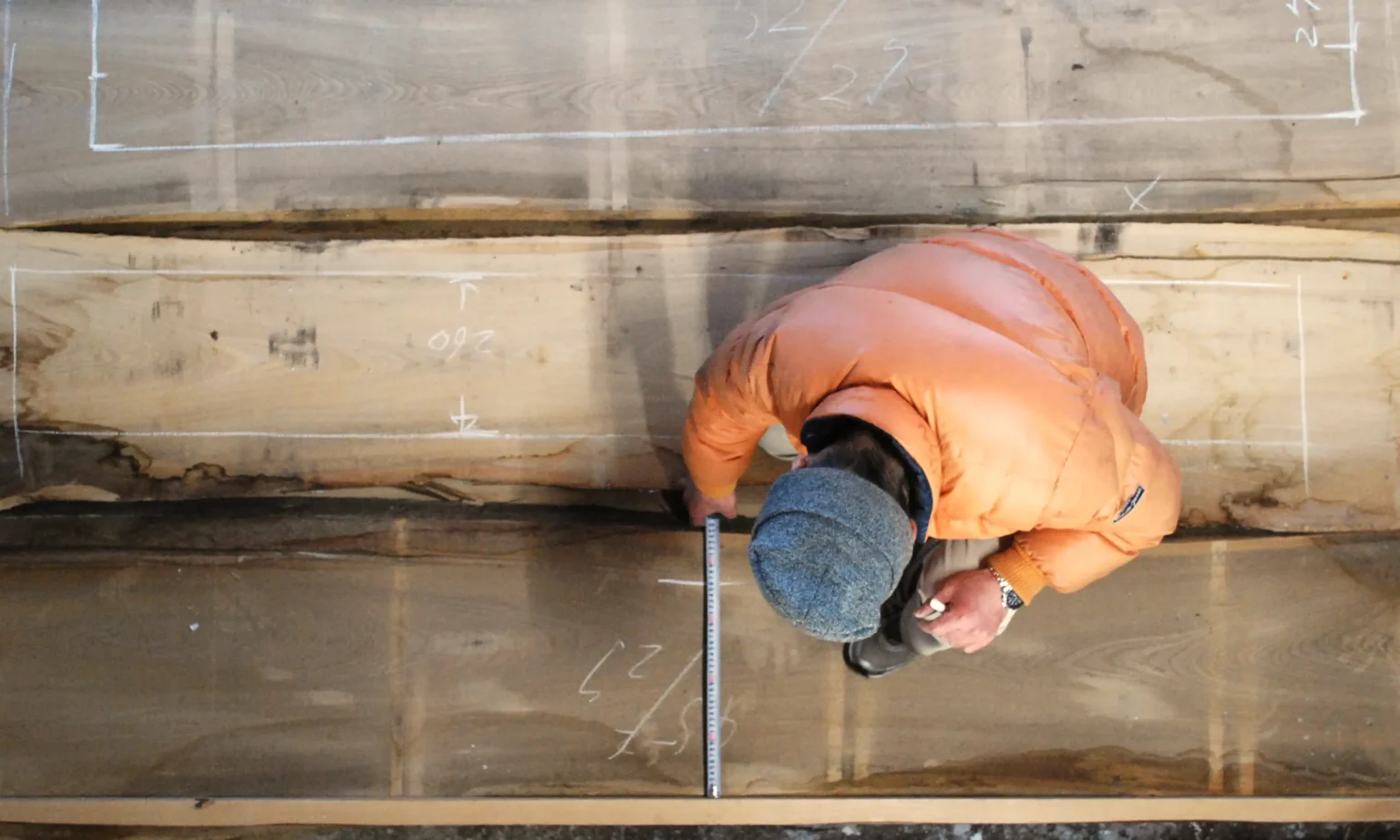 「木取り」とは、材木となるよう加工することを言います。原板が木材として使うために姿を変える事と言ってもいいのではないでしょうか。乾燥後、木目の流れや節の状態を読みながら、適材適所を見極めて必要な形に切っていきます。