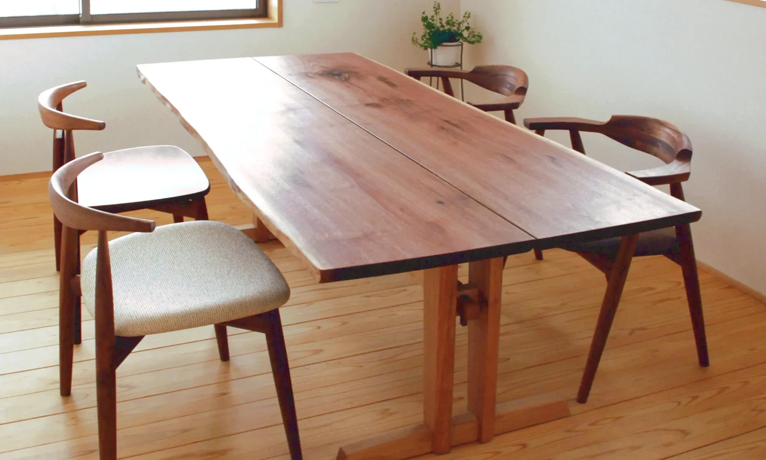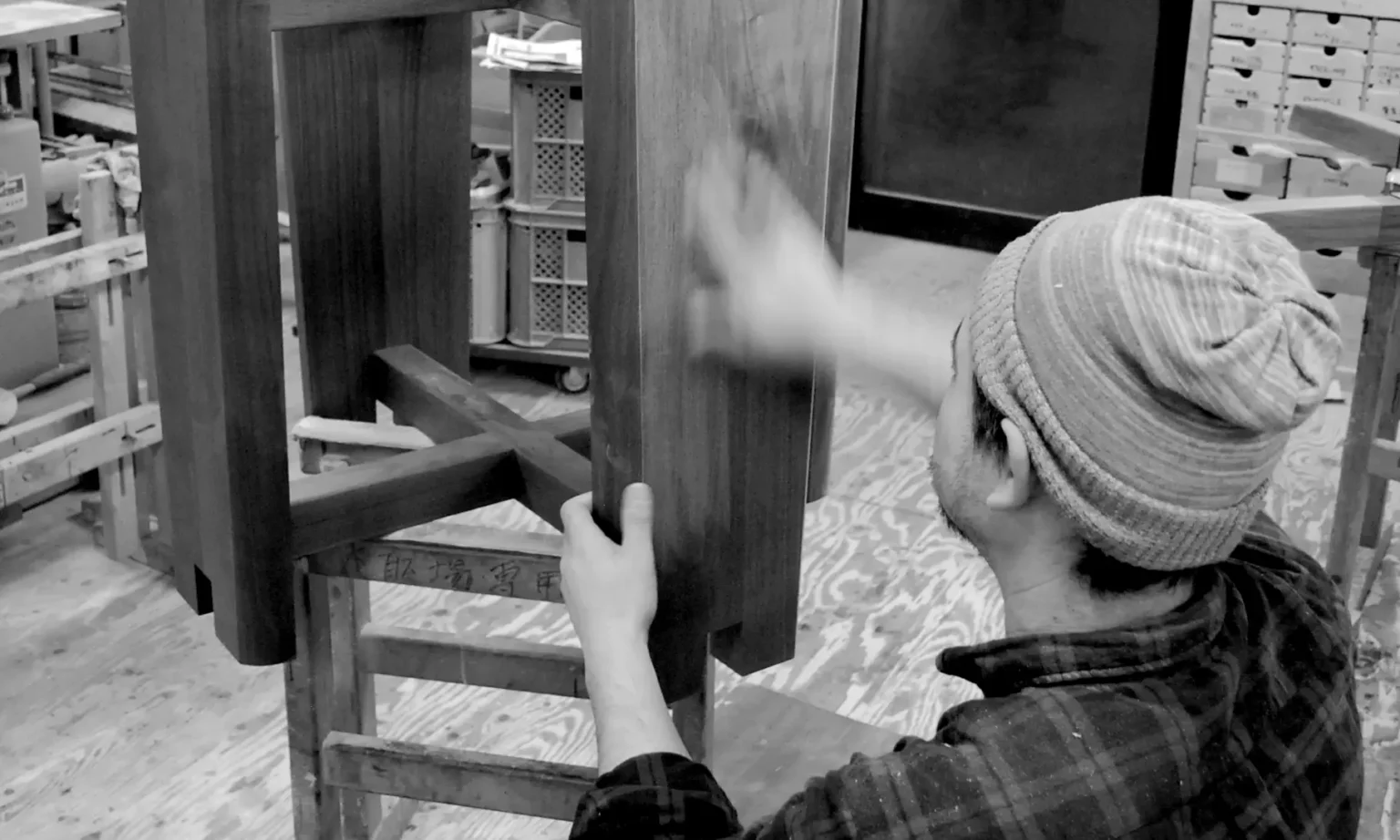 それぞれの部材を組み上げます。「木は木で締める」という日本伝統の木造建築技術。それを応用した木組みよって接合されるブックマッチテーブルなどがあります。椅子やスツール、金具締結のテーブル等、お客様のニーズに合わせた様々な組み立て方があります。